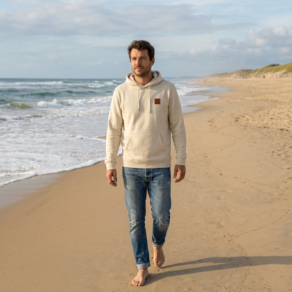 Conçu pour les journées fraîches au bord de l’océan, les soirées autour d’un feu de camp ou simplement pour un confort absolu au quotidien, ce hoodie allie élégance minimaliste et performance écologique.