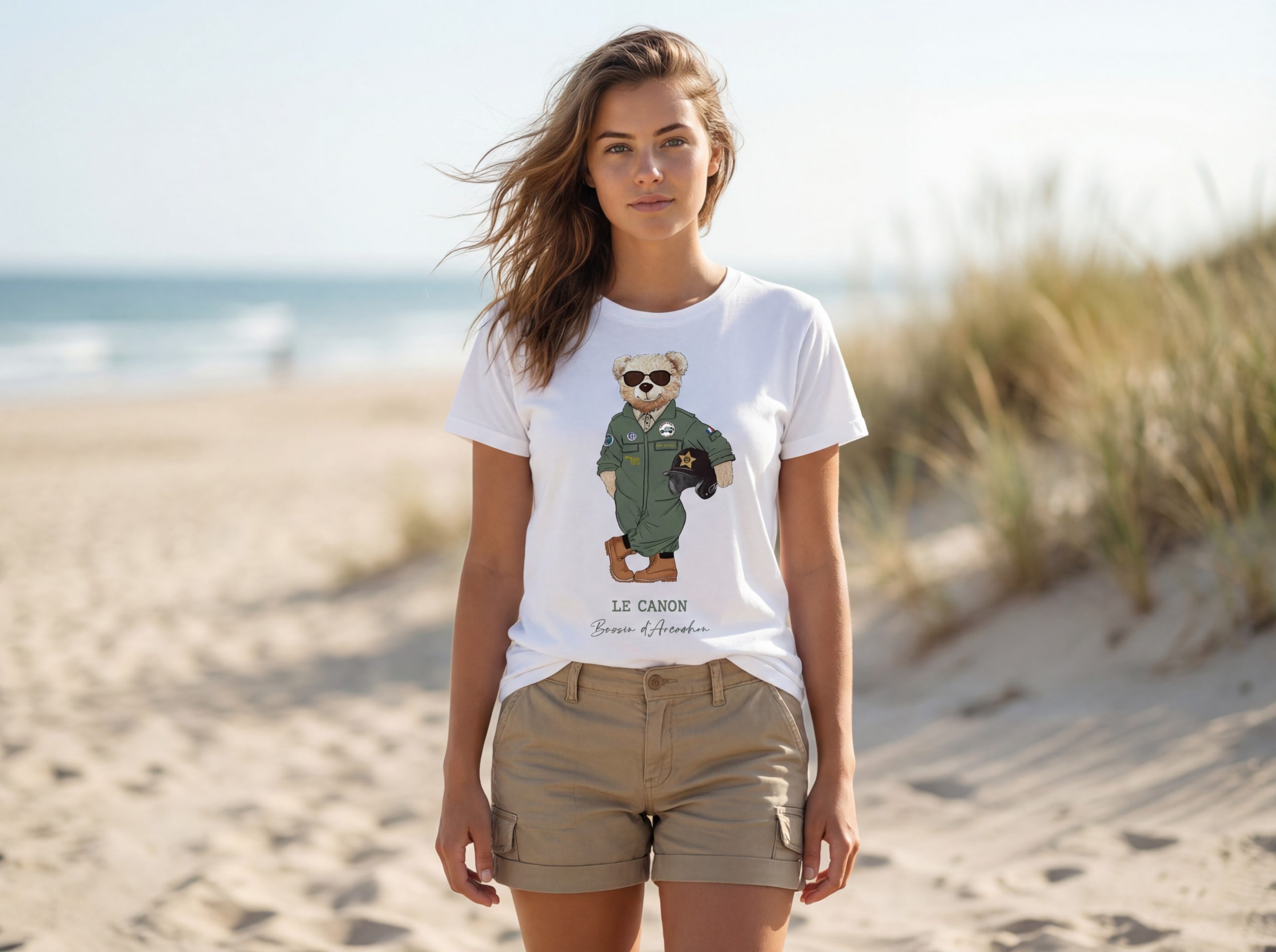 Notre ours aviateur porte fièrement sa veste de pilote kaki, ses lunettes de soleil et son casque vintage. Un clin d’œil à l’histoire aéronautique du Bassin et à l’esprit aventurier du Cap Ferret. La signature « Bassin d’Arcachon » ancre définitivement cette création dans son territoire.