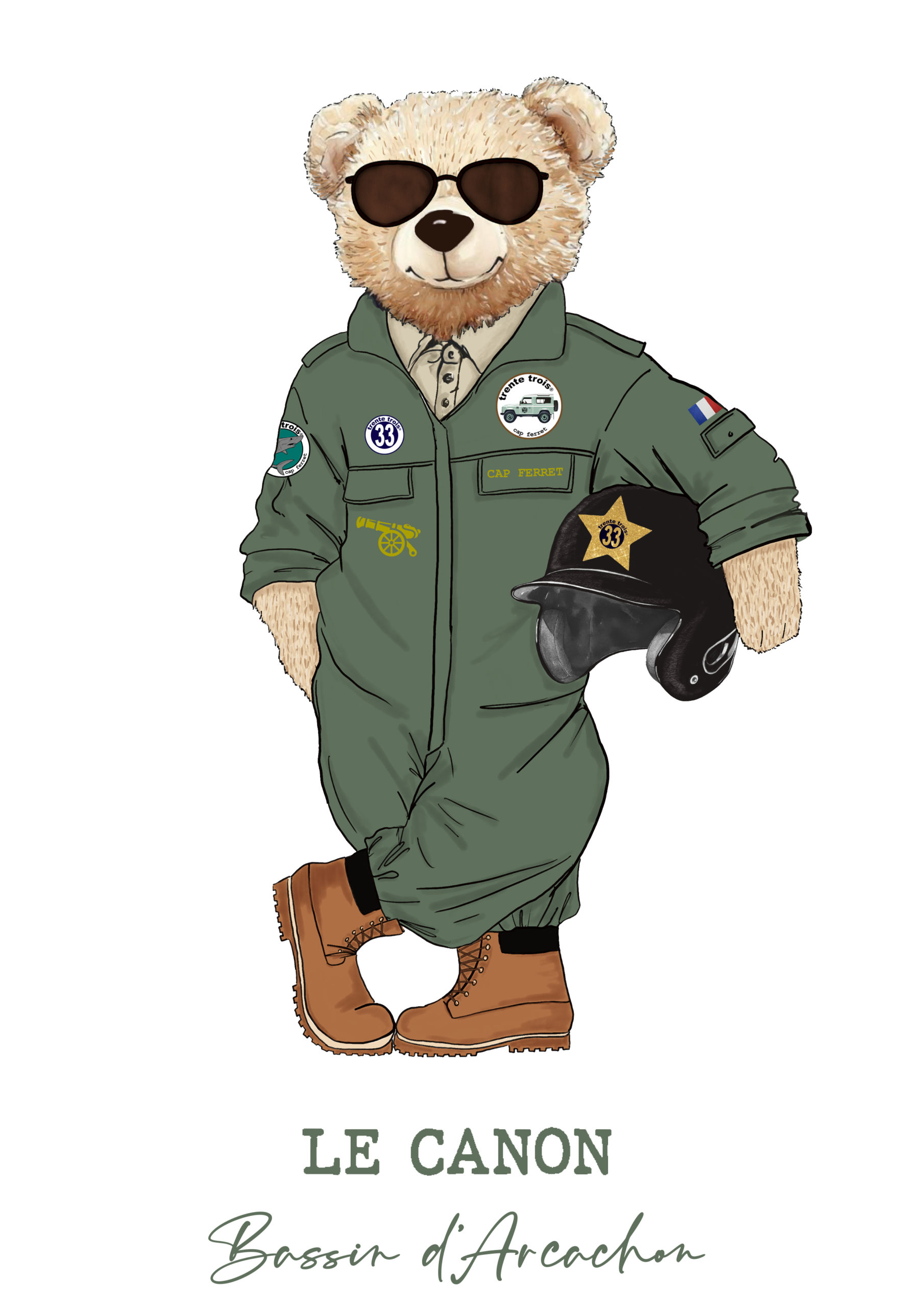 Notre ours aviateur porte fièrement sa veste de pilote kaki, ses lunettes de soleil et son casque vintage. Un clin d’œil à l’histoire aéronautique du Bassin et à l’esprit aventurier du Cap Ferret. La signature « Bassin d’Arcachon » ancre définitivement cette création dans son territoire.