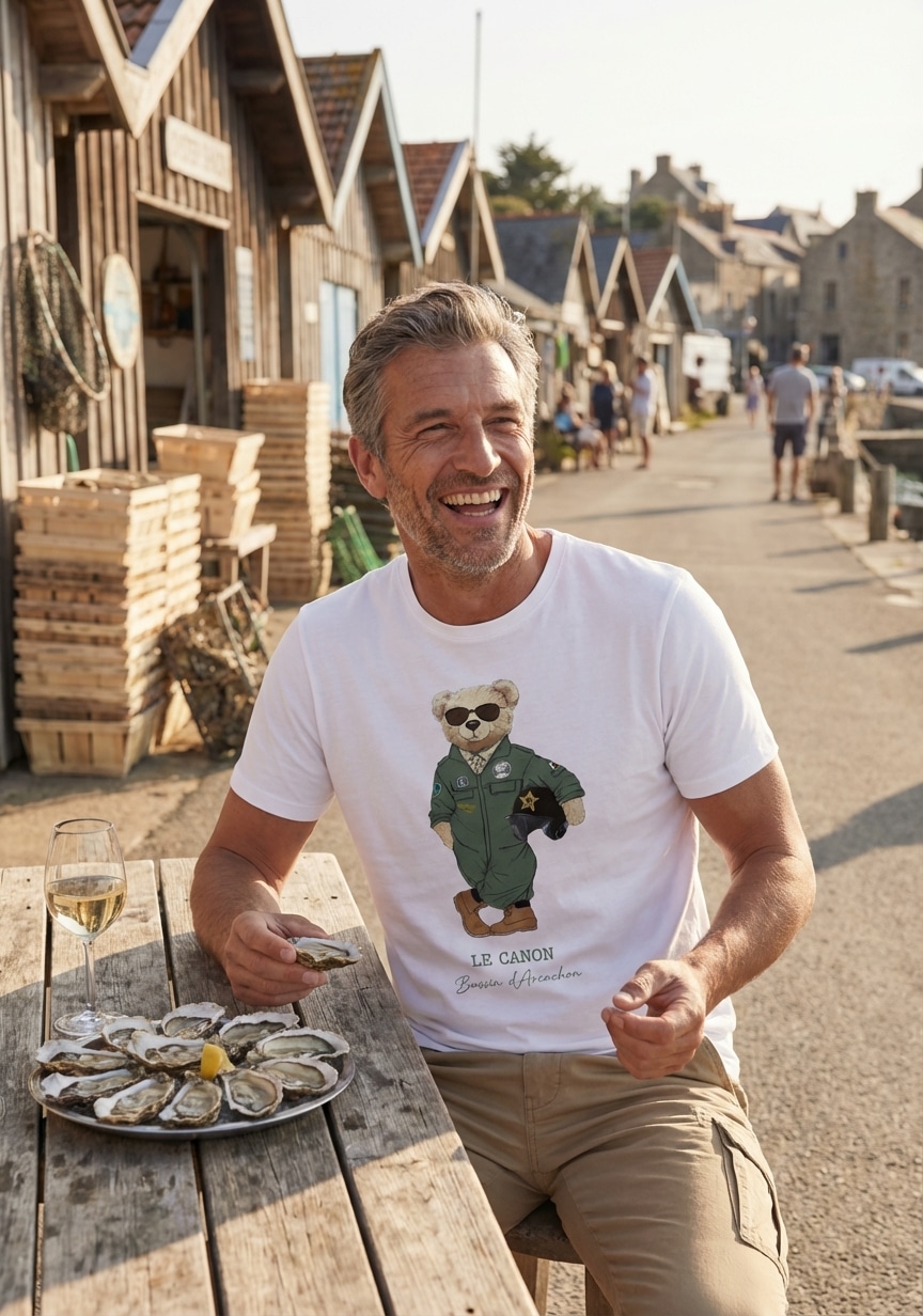 Découvrez « Le Canon », notre t-shirt signature qui célèbre l’art de vivre du Bassin d’Arcachon. Cet ours aviateur au style vintage devient l’emblème d’un lifestyle décontracté et raffiné, typique du Cap Ferret. Un t-shirt en coton bio, créé localement