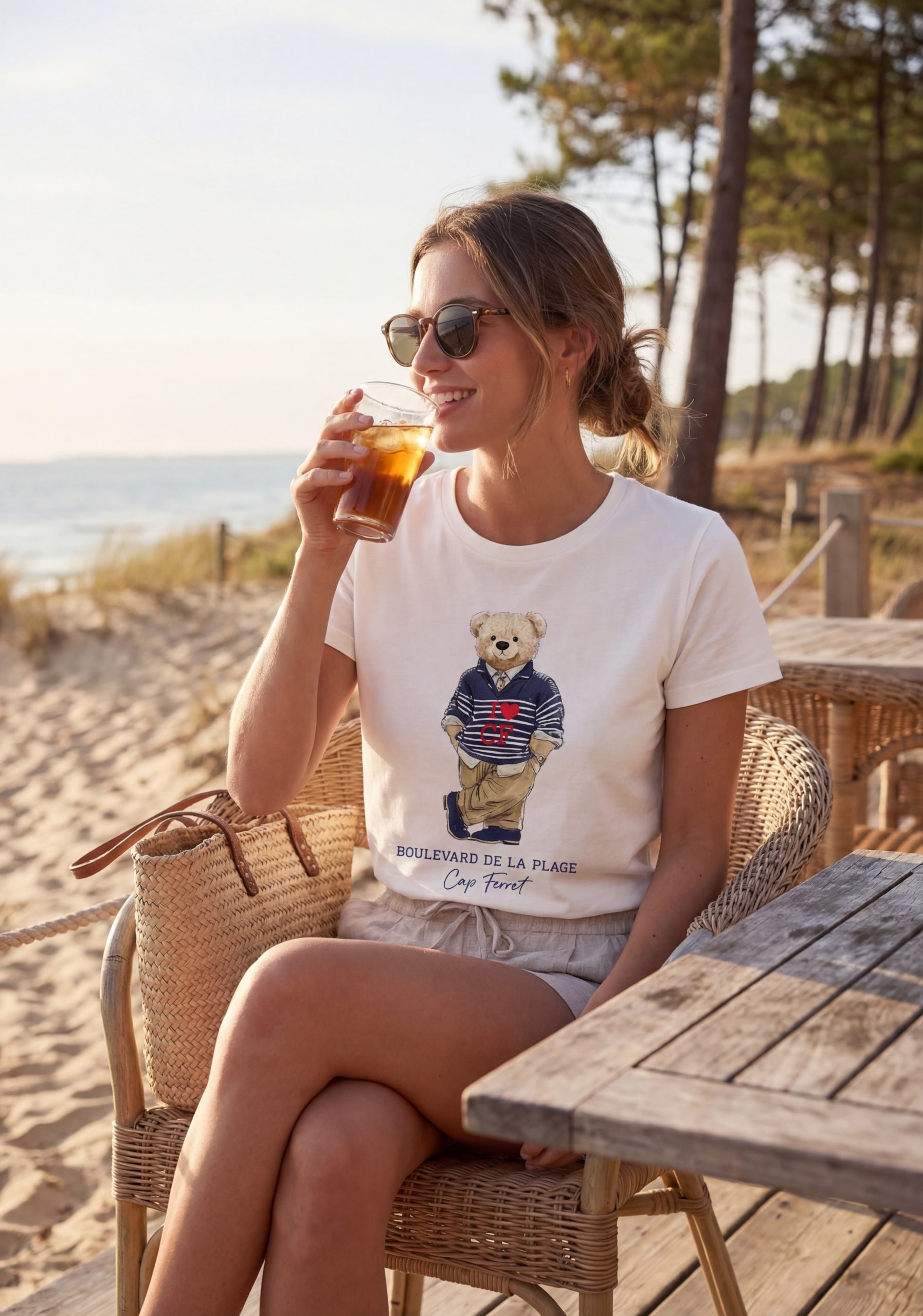 Chaque pièce est designée au Cap Ferret par Tiffany, la créatrice inspirée par le Bassin, puis imprimée au Cap Ferret dans notre atelier local. Cette démarche 100% locale garantit une qualité irréprochable et un impact environnemental minimal. Notre coton bio certifié offre une douceur exceptionnelle et respecte votre peau comme la planète.