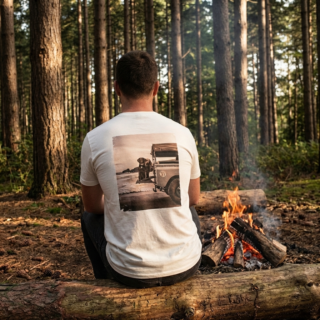Ce t-shirt s’adresse aux amoureux de nature, de surf trips, de camping sauvage et de defender. Il capture l’essence des moments simples et authentiques : un feu de camp, une forêt de pins, l’océan à l’horizon.