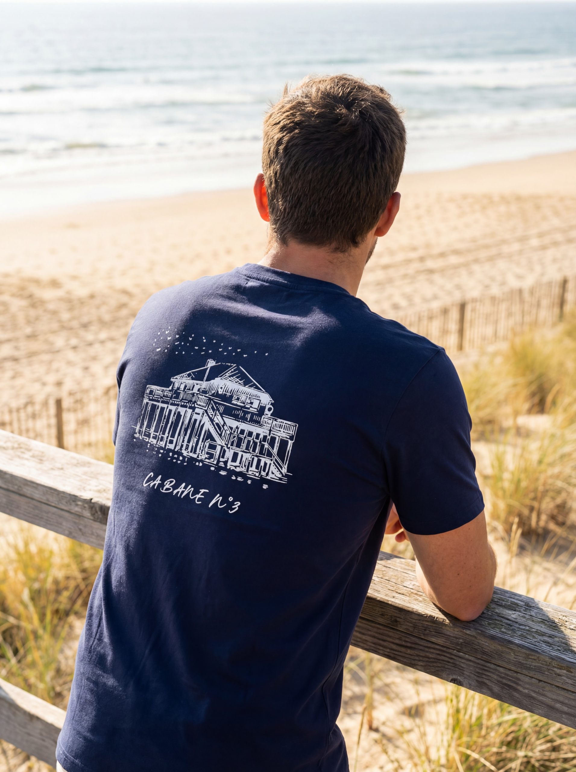 La Cabane N°3, avec son architecture caractéristique et son numéro fièrement affiché, est devenue un point de repère pour tous ceux qui naviguent sur le bassin. Entièrement refaite en 2025, notre teeshirt rend hommage à celle qui est pour les locaux un monument.